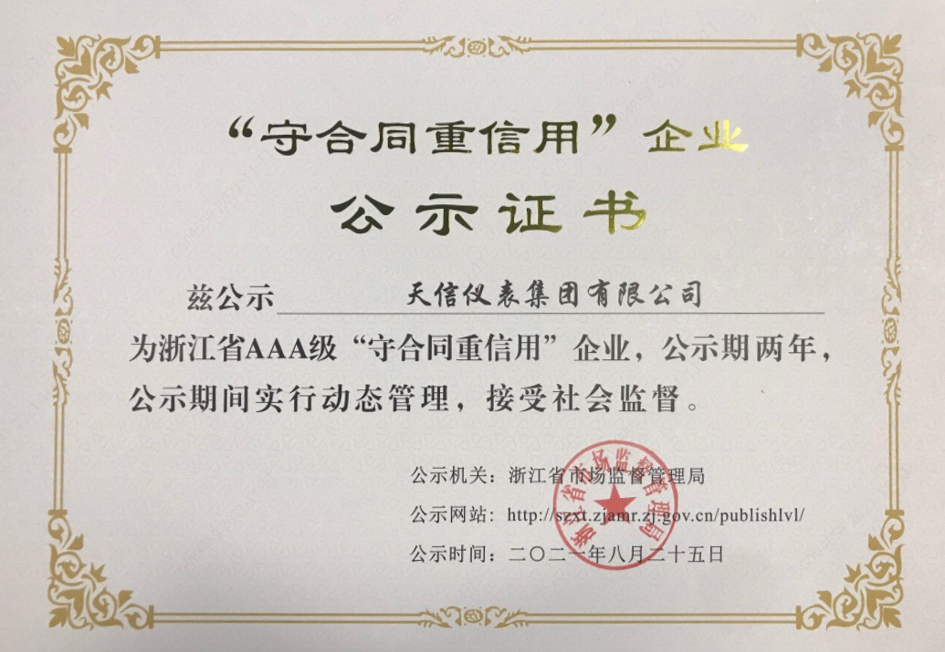 浙江省AAA級“守合同重信用”企業證書